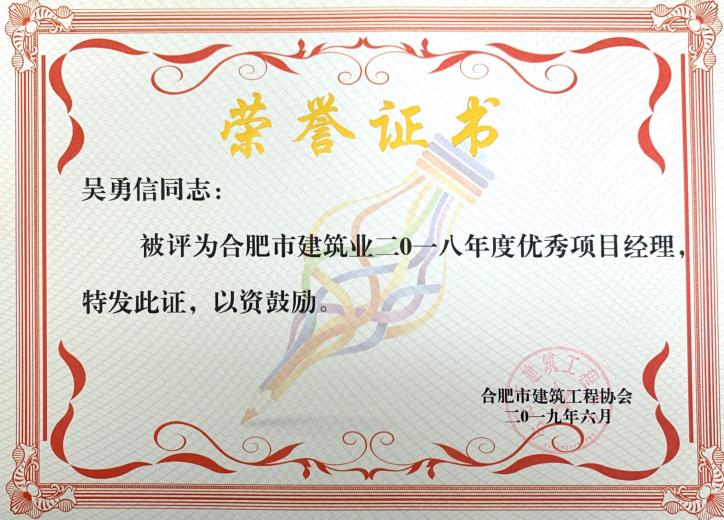 合肥市建筑业2018年度优秀项目经理——吴勇信