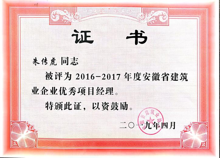 >2016-2017年安徽省建筑业优秀项目经理——朱传虎