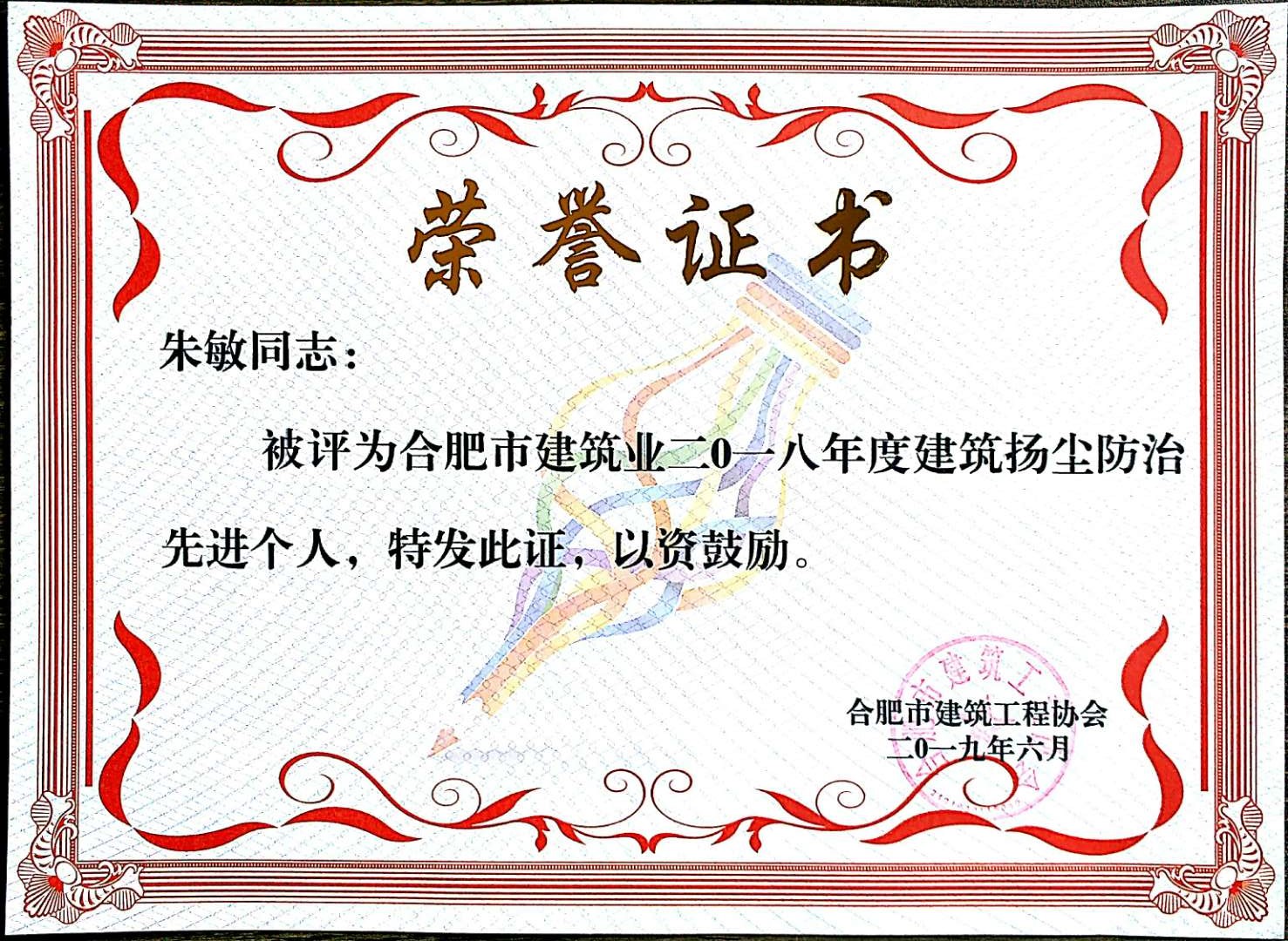 >朱敏2018年防尘优秀个人