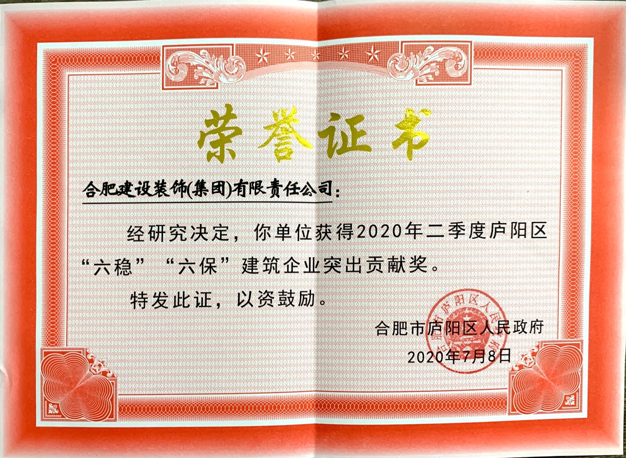 2020年二季度庐阳区六稳六保建筑业突出贡献奖