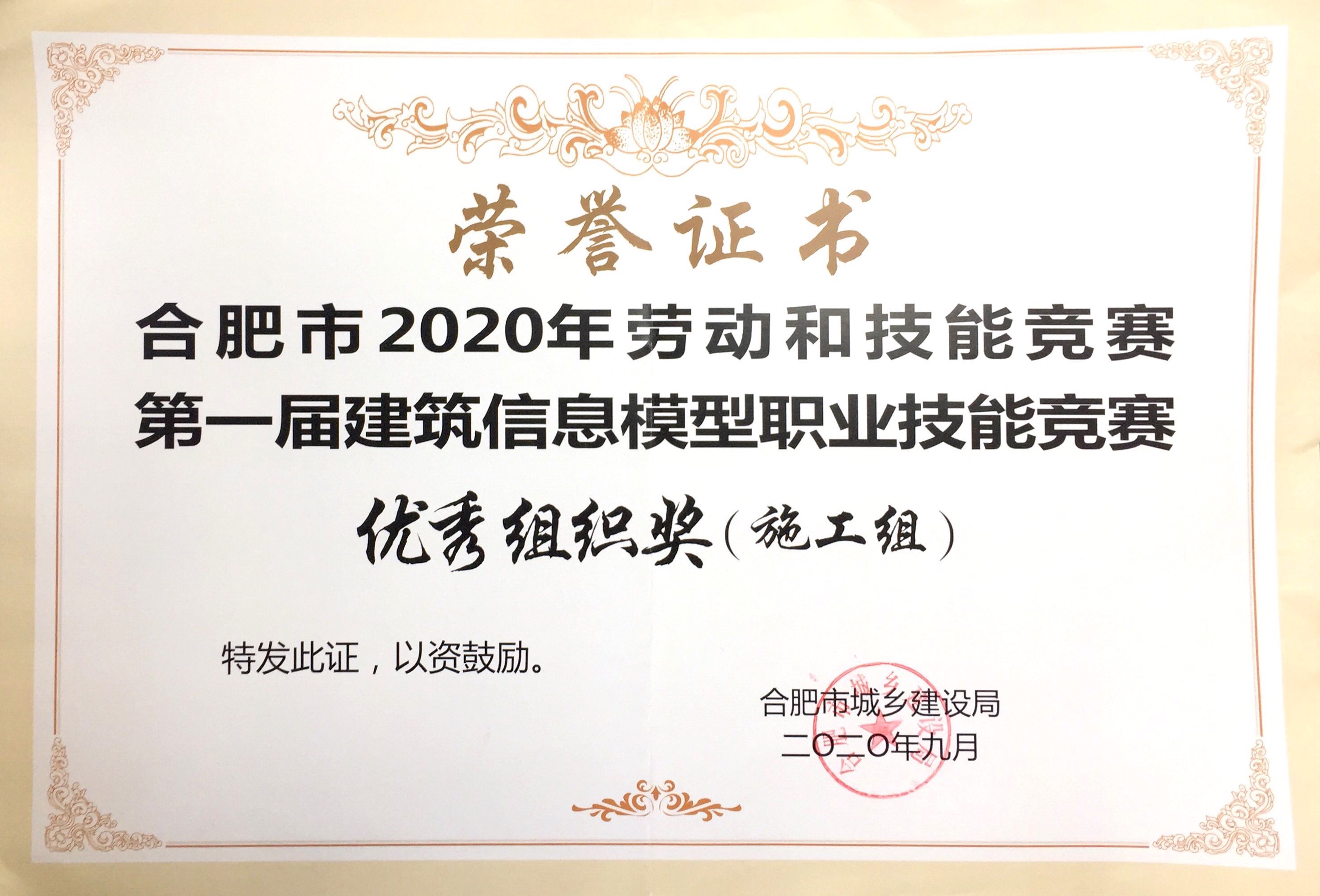 >合肥市2020年劳动和技能竞赛第一届建筑信息模型职业技能竞赛优秀组织奖(施工组)