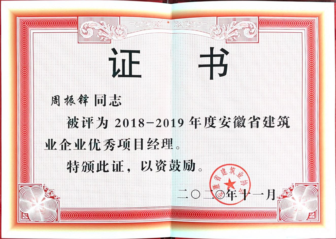 >2020年安徽省建筑业企业优秀项目经理--周振铎