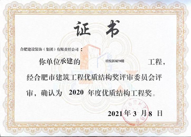 >禧悦新城7#楼——2020年度合肥市建筑工程优质结构奖