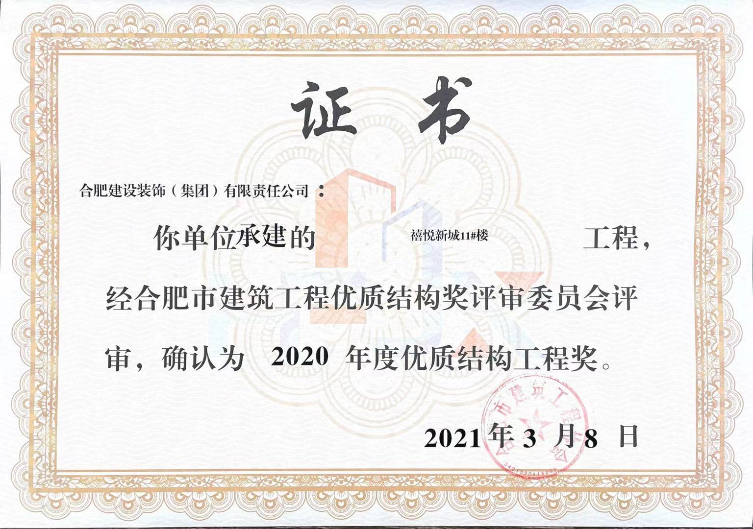 >禧悦新城11#楼——2020年度合肥市建筑工程优质结构奖