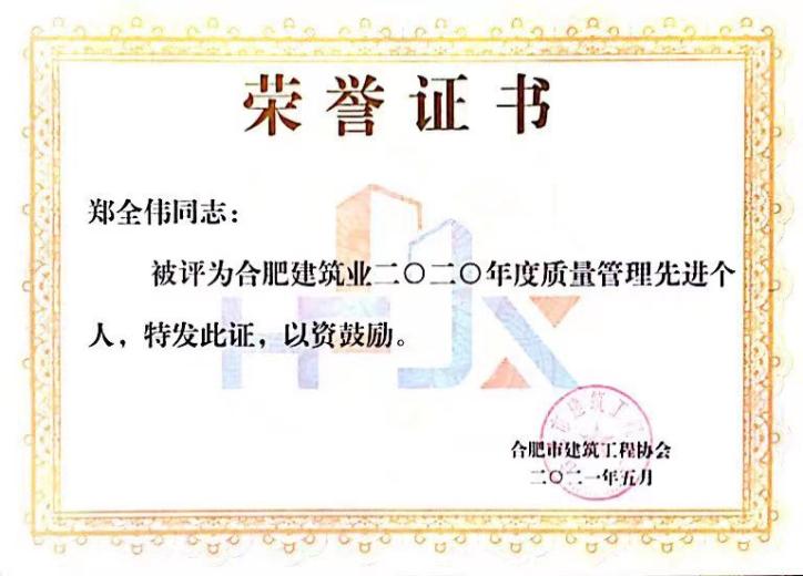 >2020年度合肥建筑业质量管理先进个人——郑全伟